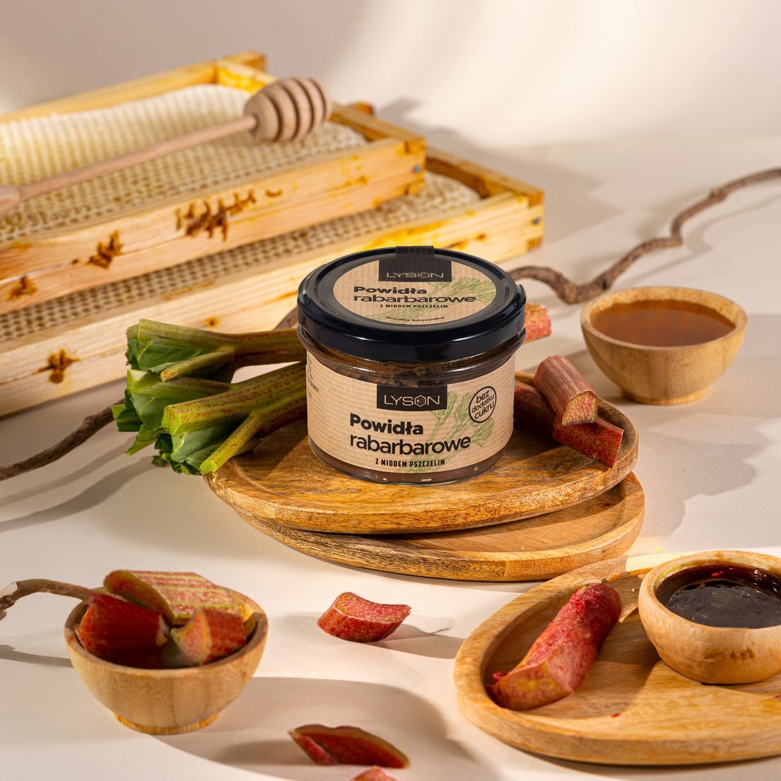 rabarbar (82,8%), miód wielokwiatowy (11,4%), miód gryczany (5,7%), propolis. Sporządzono z 166g owoców na 100g produktu.