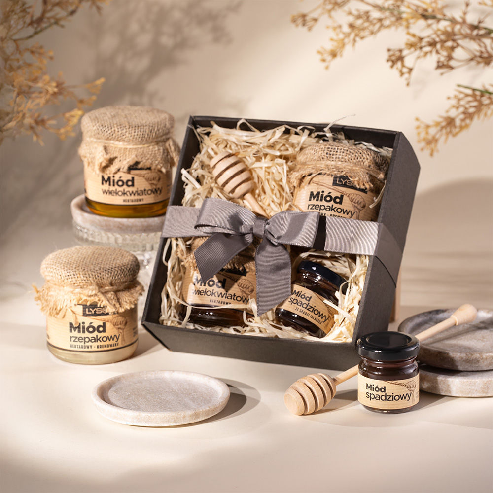 miodów, zapakowanych w ozdobne pudełko z kokardą i drewnianą pałeczką. Nie