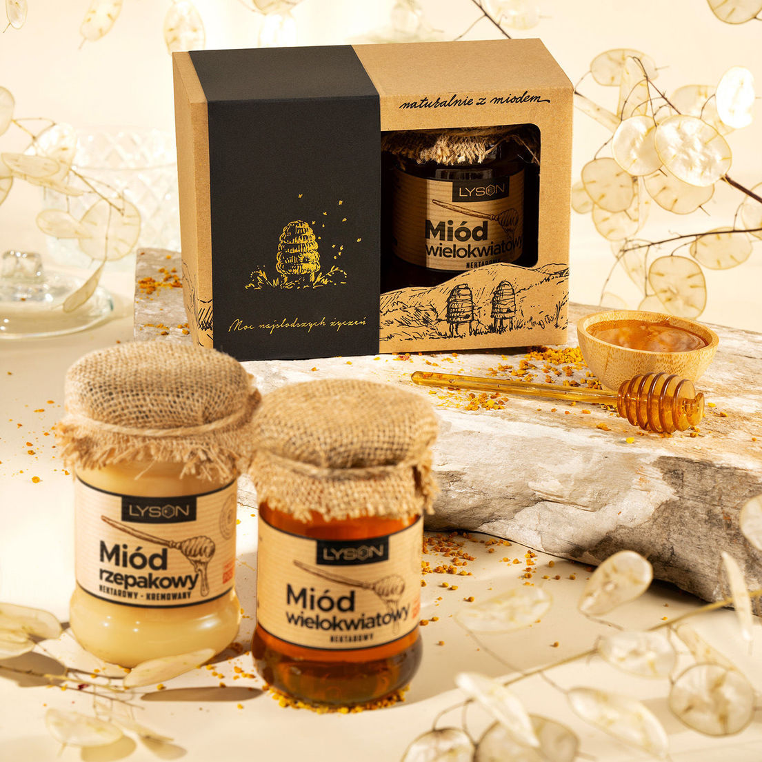 przedstawiającą panoramę Beskidów ukryliśmy dwa klasyczne miody: wielokwiatowy