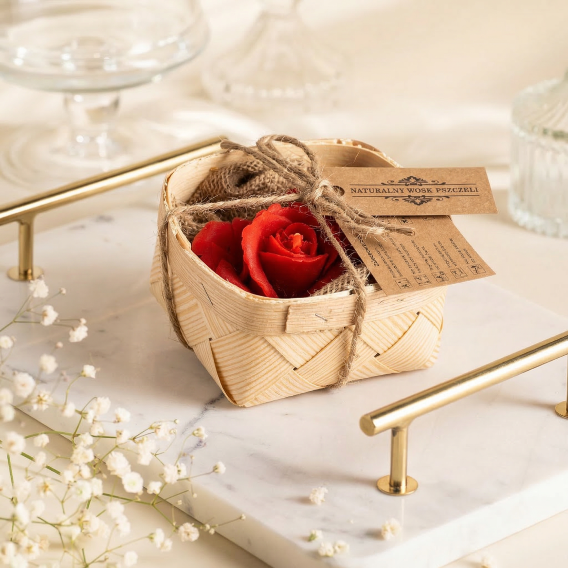 Świeca z wosku pszczelego czerwona róża w łubiance
